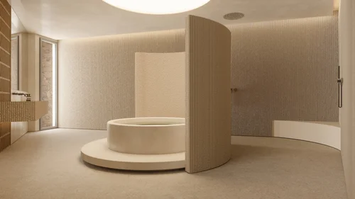 Gallery: The gallery space is accessible from the residence entrance and connects to the dining area and the connecting hallway. It is adorned with wood on the vertical surfaces, where full paneling sections display artworks from the client's collection. Custom-made clasps were constructed for the openings, designed to open and close flush with the paneling and featuring a pattern created from the same wood that covers all the walls and fixtures, filtering incoming natural light. The curved ceiling of the gallery, divided into three sections by monochromatic decorative plasterwork, is illuminated with scattered optical fibers resembling a starry sky. It is framed by a decorative border that describes the hidden lighting towards the dome, with a pattern made of smaller and larger square wooden modules. Special consideration has been given to the integration of electrical and mechanical installations to make them visually inconspicuous and fully integrated into the interior surfaces. The floor is described by white marble, while the largest area inside is occupied by the herringbone patterned wooden floor of European oak in Versailles motif.