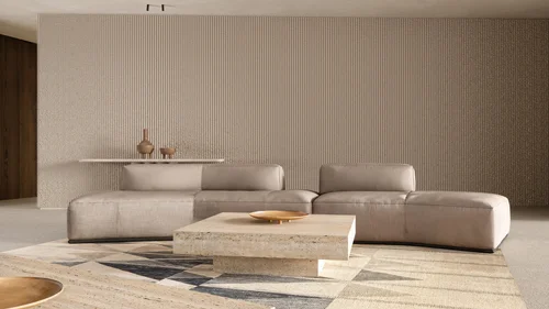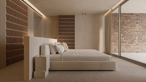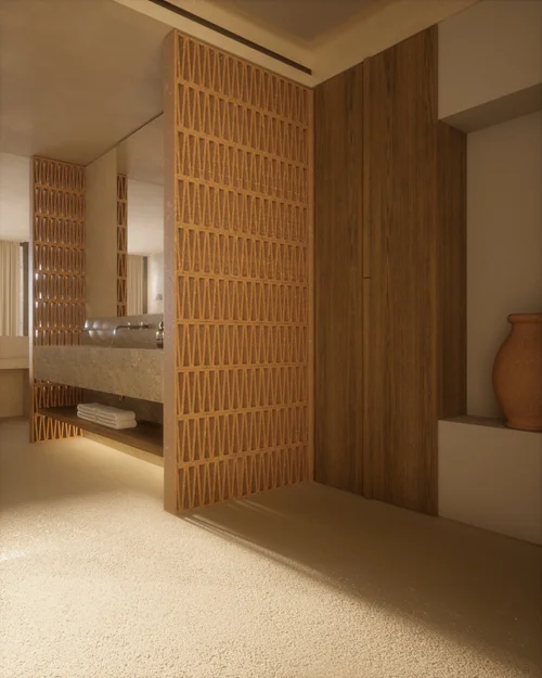 Materials: Marble and wood surfaces constitute the focal point of the space's aesthetics. The incorporation of wood and marble in various patterns and finishes throughout the rooms creates a visually balanced ensemble, utilizing a color palette that includes off-white, earthy oak, and some black accents. The wooden surfaces that dominate the spaces are accentuated by their treatment, both on the vertical surfaces and on the doors with paneling, as well as with custom decorative patterns around the ceilings.