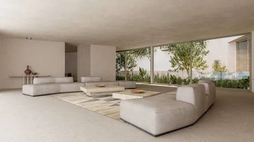 Connecting Hallway: The new transitional space connects the elevated section of Building A's upper floor with its extension and specifically serves as a pivotal point between the gallery and the main living room. Wood with paneling dominates the vertical surfaces, unfolding onto the perimeter of the white ceiling. At the junction of the two materials, a discreet gap is incorporated, offering climatic comfort. Here, we also find the clasps at the opening towards the outdoor space of the residence. The white marble floor is internally defined by two black marble frames, accentuating the scale of the space, which hosts artworks from the client's magnificent collection.